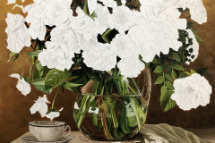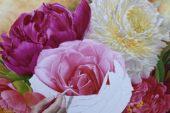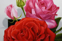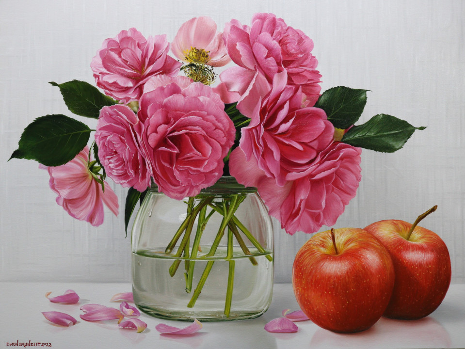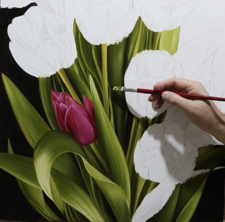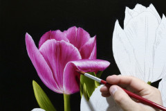 Estudo base de desenho, estudo na gama de cores e variações nos tons, estudos detalhados em texturas de pétalas, desenvolvimento de cenário, montagem de cena, proporções, seleção e escolha de fotos referência, luz, sombras, estudo passo a passo na elaboração e misturas de cores para a pintura.