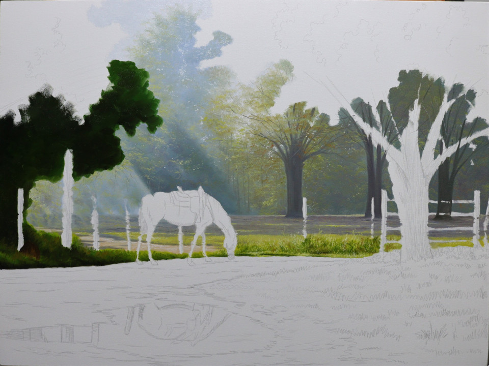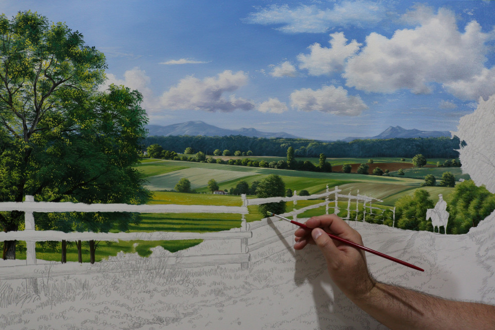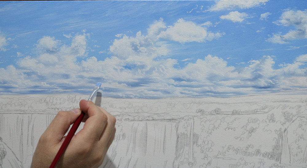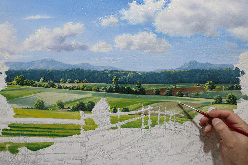 Estudo de desenho, estudo na gama de cores e variações nos tons na paisagem realista, estudos detalhados em nuvens, em árvores, montanhas, relva, água, transparências e reflexos em água, perspectiva atmosférica, perspectiva arquitetônica, paisagem com animais e figurativo humano, proporções e profundidade atmosférica, seleção e escolha de fotos para montagem de cena, luz, sombras, a variação de cores em uma paisagem conforme o horário do dia (manhã, tarde, pôr do sol e noite).
