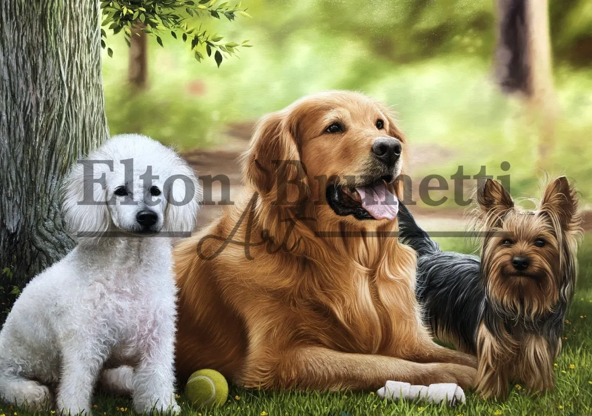 Quadro “Cães amigos”, pintado pelo artista plástico Elton Brunetti, técnica Óleo Sobre Tela, medindo 60 x 80 cm.