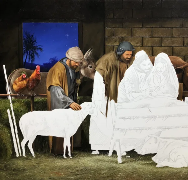Quadro nascimento de Jesus, pintado pelo artista plástico Elton Brunetti, técnica Óleo Sobre Tela medindo 60 x 100 cm.