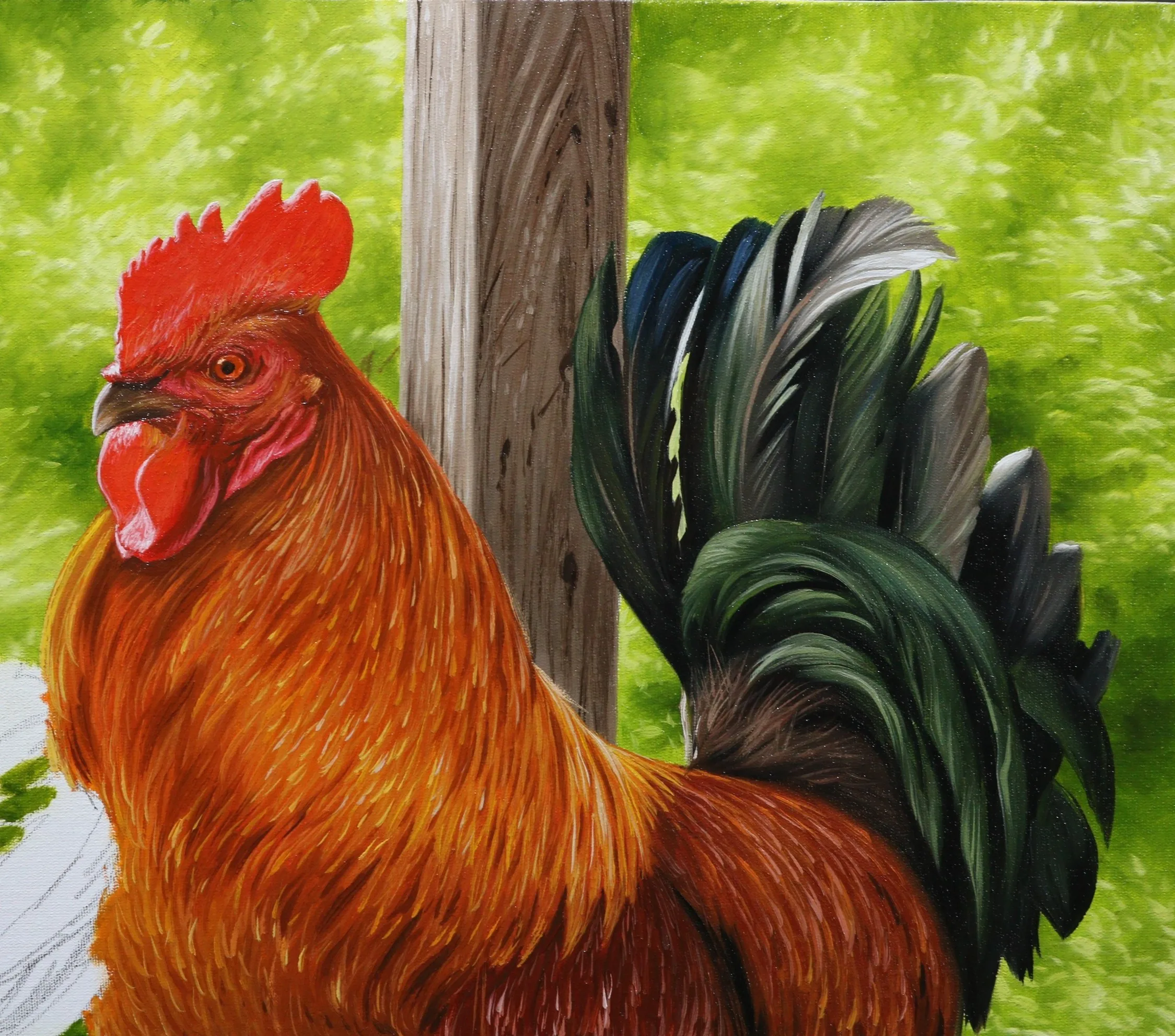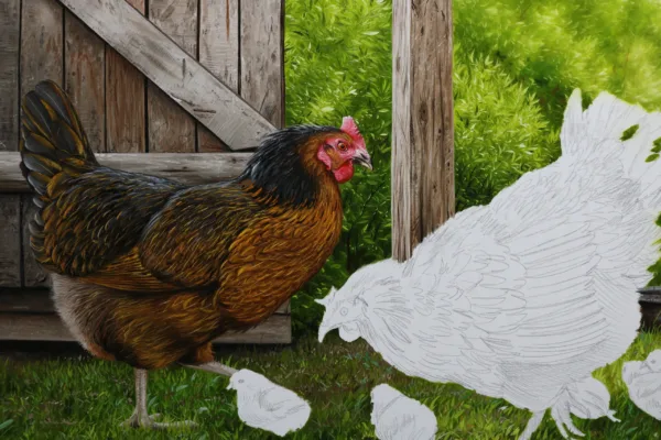 Quadro Galinhas, pintado pelo artista plástico Elton Brunetti, técnica Óleo Sobre Painel medindo 60 x 100cm.