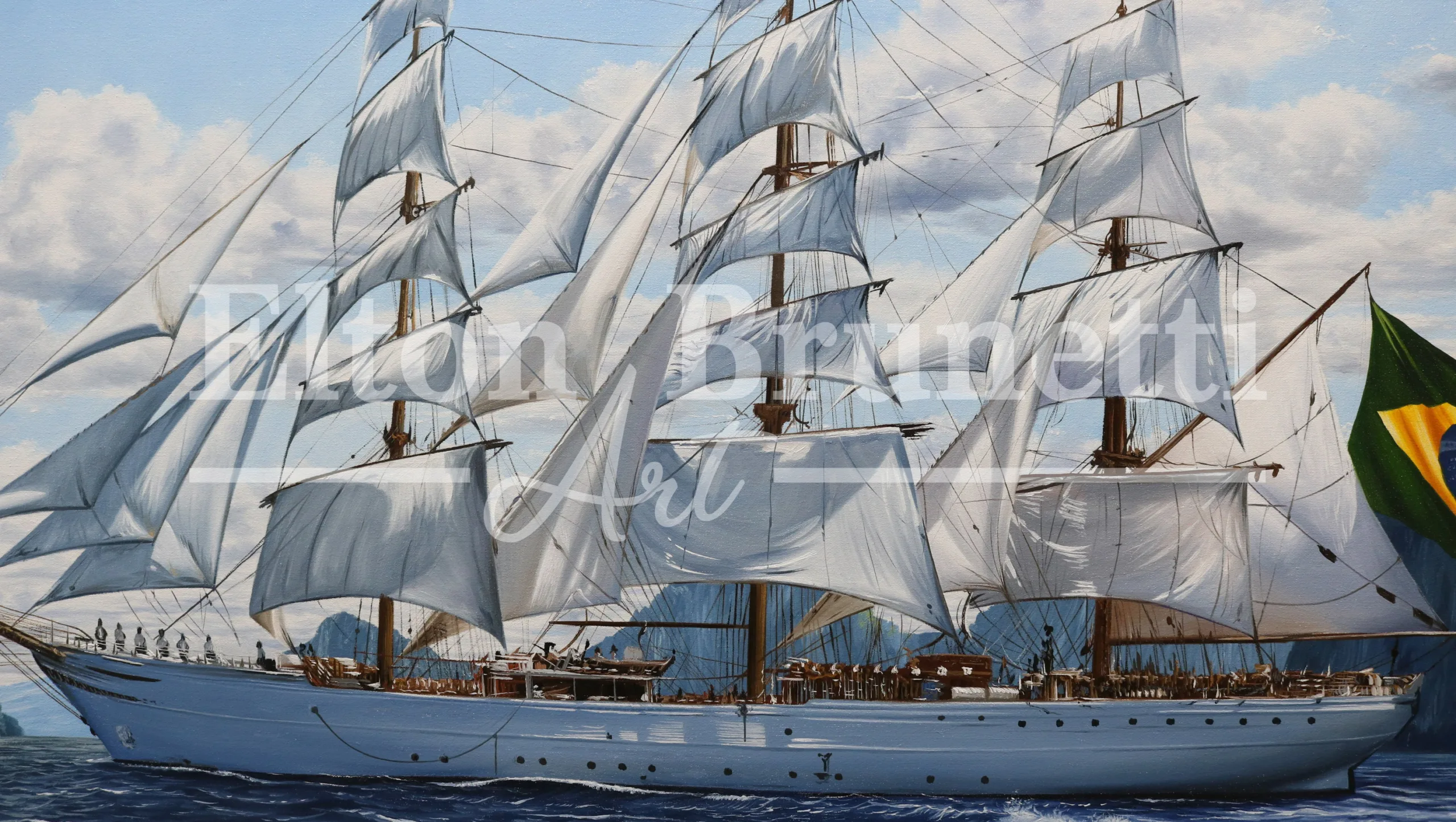 Quadro Veleiro Cisne Branco, pintado pelo artista plástico Elton Brunetti, técnica Óleo Sobre Tela medindo 60 x 100 cm.